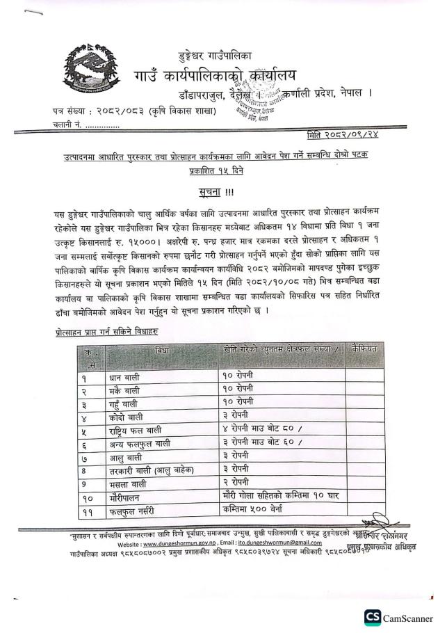 उत्पादनमा आधारित पुरस्कार ता प्रोत्साहन कार्यक्रमका लागि आवेदन पेश गर्ने सम्बन्धि १५ दिने सूचना ।