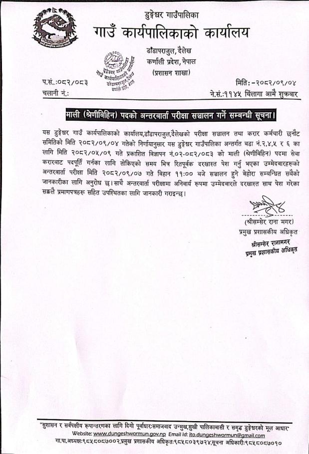 माली (श्रेणीविहिन) पदकाे अन्तरवार्ता परीक्षा सञ्चालन गर्ने सम्बन्धी सूचना ।