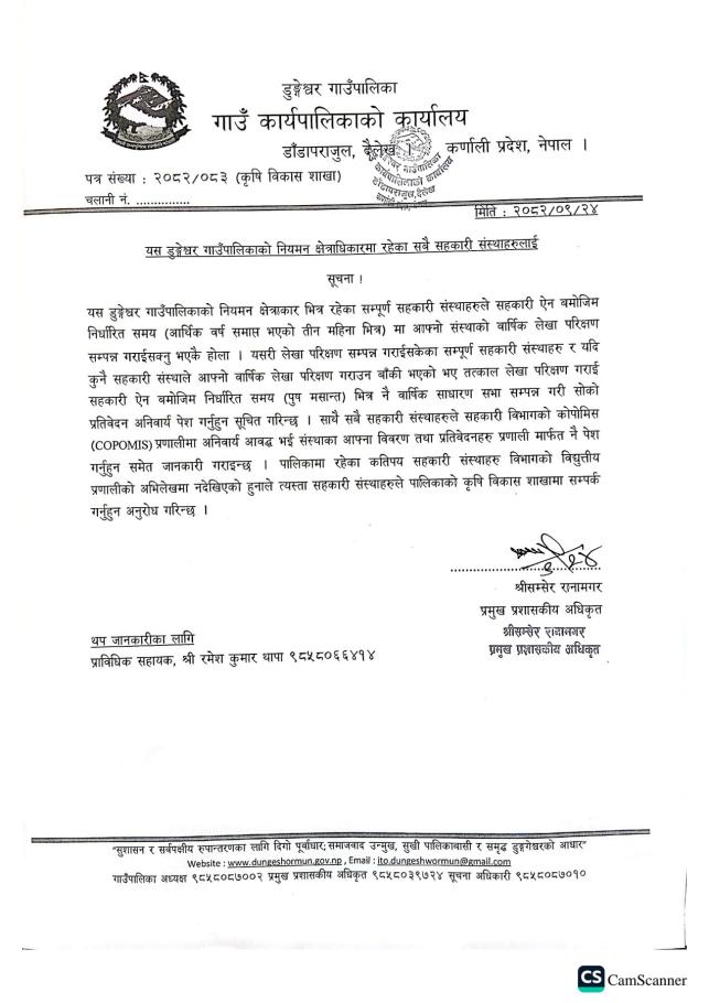 यस डुङ्गेश्वर गाउँपालिकाको नियमन क्षेत्राधिकारमा रहेका सबै सहकारी संस्थाहरुलाई सूचना !