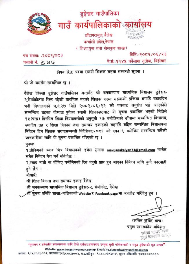 रिक्त पदमा स्थायी शिक्षक सरुवा सम्बन्धी सूचना ।