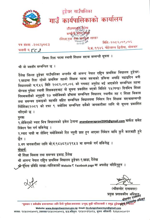 रिक्त पदमा स्थायी शिक्षक सरुवा सम्बन्धी सूचना ।