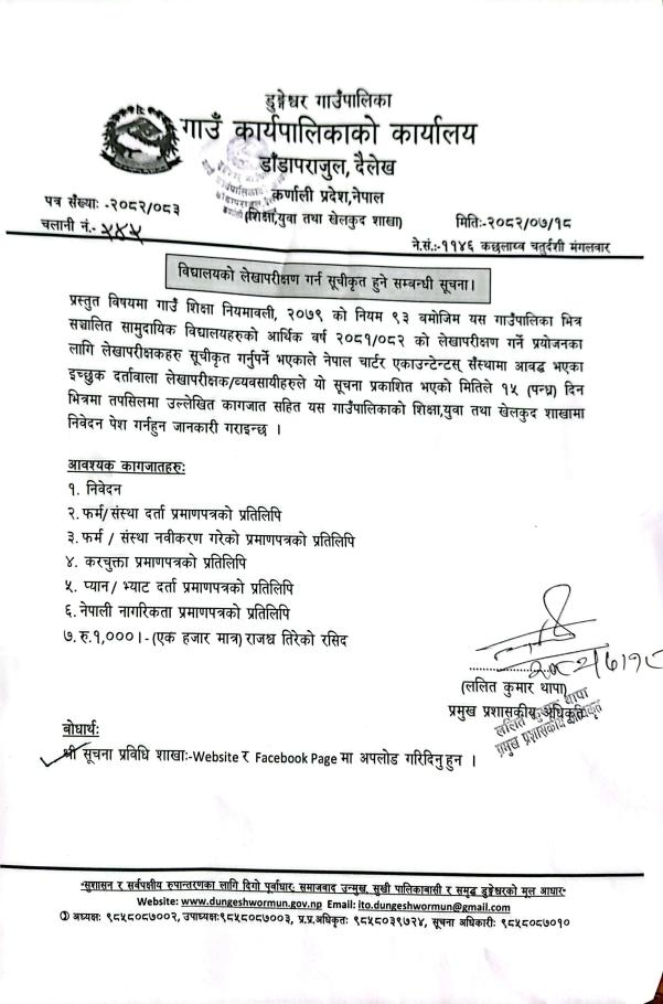 » विद्यालयकाे लेखापरीक्षण गर्न सूचीकृत हुने सम्बन्धी सूचना ।
