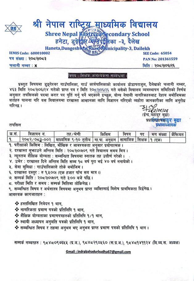 » शिक्षक आवश्यकता सम्बन्धमा ।