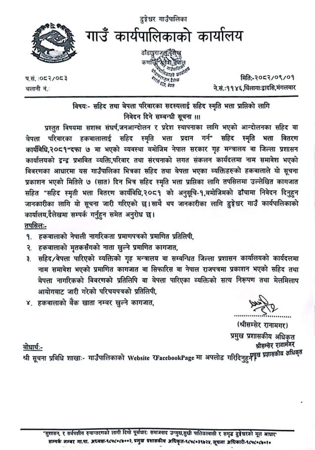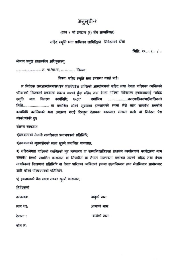सहिद तथा बेपत्ता परिवारका सदस्यलाई सहिद स्मृति भत्ता प्राप्तिको लागि निवेदन दिने सम्बन्धी सूचना !