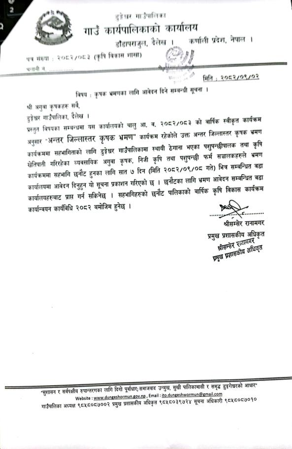 कृषक भ्रमणका लागि आवेदन दिने सम्बन्धि सूचना ।