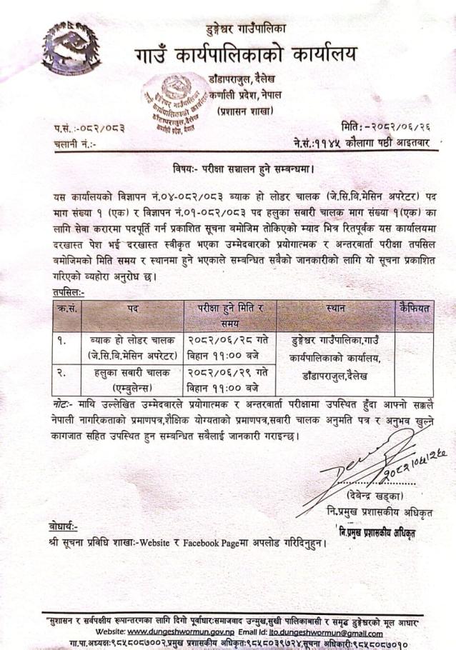 ब्याक हाे लाेडर चालक (अपरेटर) पदमा करारमा पदपूर्ति गर्ने सम्बन्धी सूचना ।