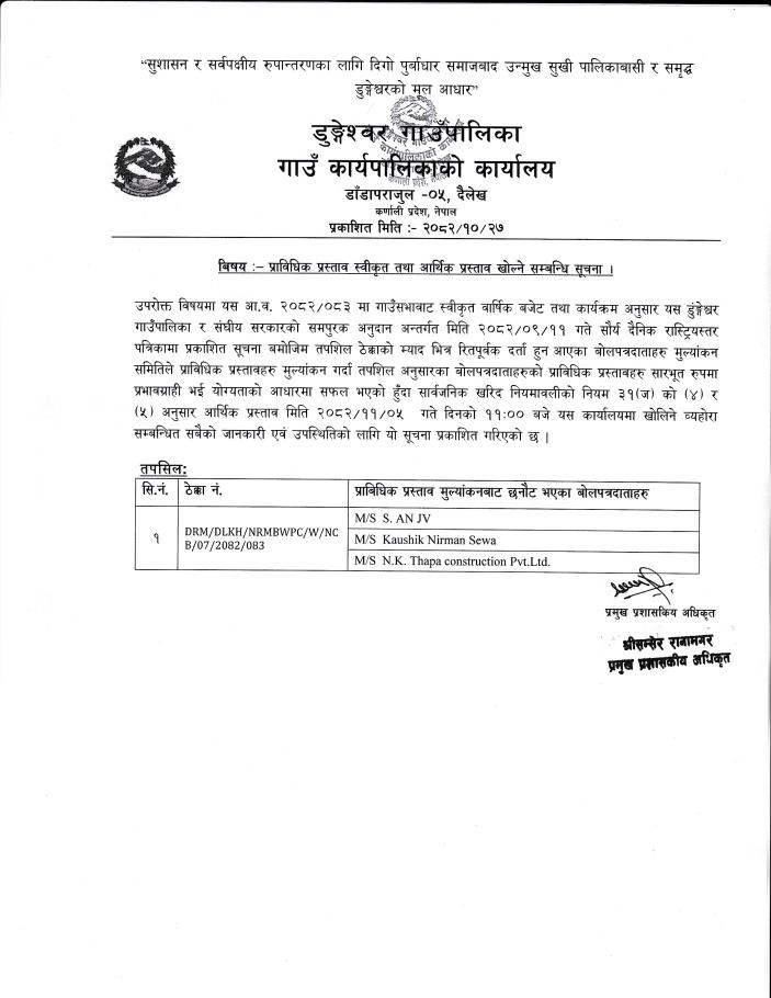 » प्राविधिक प्रस्ताव स्वीकृत तथा आर्थिक प्रस्ताव खोल्ने सम्बन्धि सूचना ।