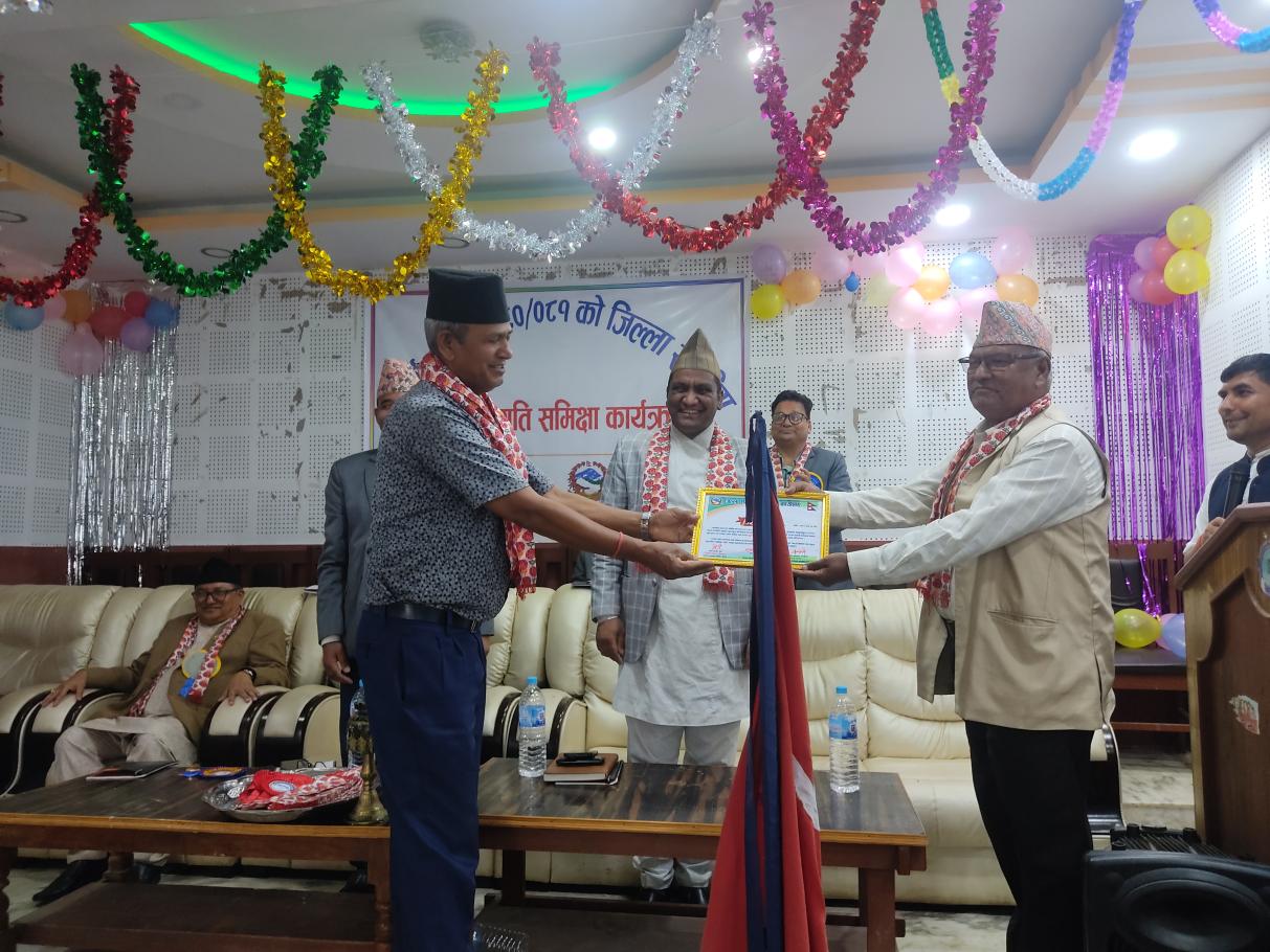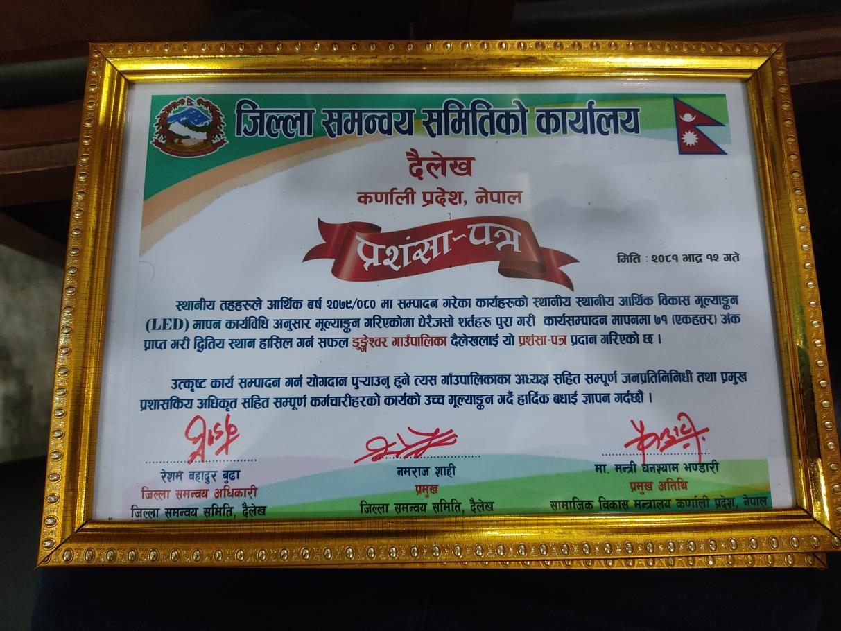 आर्थिक वर्ष २०७९/०८० को स्थानीय तह संस्थागत क्षमता स्वःमूल्याङ्कन (LISA) मा जिल्लाकाे उत्कृष्ट स्थानमा, स्थानीय आर्थिक विकास मूल्यांकन (LED) मा जिल्लाकाे दाेस्राे स्थानमा र वित्तीय सुशासन जोखिम मूल्याङ्कन (FRA) मा जिल्लाकाे तेस्रो स्थान प्रशंसा पत्र ग्रह